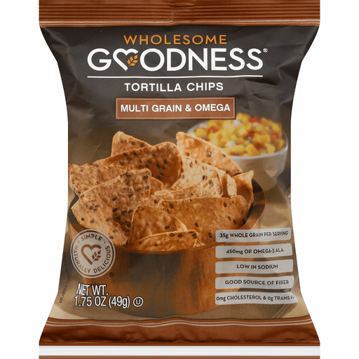 Simple. Naturally delicious. 35 g whole grain per serving. 450 mg of omega-3 ALA. Low in sodium. Good source of fiber. 0 mg cholesterol & 0 g trans fat. Bringing delicious and nutritious together like never before. Wholesome Goodness is dedicated to providing you and your family with all natural, great tasting, nutritionally dense foods that are always affordably priced. Simply said - we want you to love food that loves you back. - Jeff & Rick Co-Founders Wholesome Goodness, LLC. Using only natural ingredients, our Multi Grain and Flax Tortilla Chips are a source of whole grains and are made with a sprouted ancient whole grain medley of amaranth, millet, quinoa, sorghum and teff. Additionally, these chips deliver 35 grams of whole grain and over 450 mg of Omega-3 ALA per serving. Wholesome Goodness snack chips are made in a facility that is protective of our natural resources through energy savings, water efficiency, CO2 emissions reduction and improved indoor environmental quality. Eat 48 g or more of whole grains daily. We ban 126 ingredients that are used by other food companies. Gluten free, no MSG, 0 g trans fat, 100% natural, Kosher, low sodium, good source of fiber, 0 mg cholesterol, no preservatives.