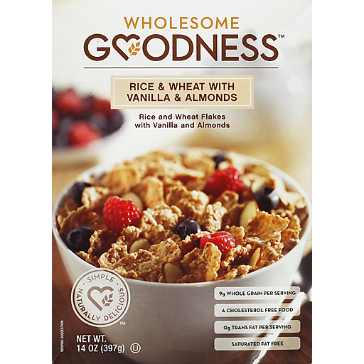 Rice and wheat flakes with vanilla and almonds. Simple. Naturally delicious. 9g whole grain per serving. A cholesterol free food. 0g trans fat per serving. Saturated fat free. What's in your cereal? We're dedicated to providing you and your family with a broad range of products that are simple, naturally delicious and always affordable. Most folks would agree that breakfast is the most important meal of the day. That's why we take great pride in our Wholesome Goodness cereals. Hot or cold, they make for a perfect start to your morning. Accented with the taste of honey roasted almonds, our Rice & Wheat with Vanilla & Almonds are low in fat and deliver 9 grams of whole grains per serving. Studies have shown that whole grains lower the risk of certain chronic diseases as part of an overall healthy diet. Wholesome Goodness - bringing delicious and nutritious together like never before. Carton made from 100% recycled paperboard. Minimum 60% post-consumer content. www.wholesome-goodness.com.