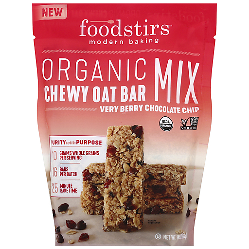USDA Organic. Certified organic by ISDA. Non GMO Project verified. New. Purity with purpose. 10 grams whole grains per serving. 16 bars per batch. 25 minute bake time. We weren't satisfied with the current bar scene so we decided to give you the tools to make your own! Our Very Berry Chocolate Chip Chewy Oat Bar Mix is packed with cranberries, blueberries and chocolate chips for a bright, flavorful and crowd-pleasing snack. Your typical bar just got less typical! Join our Modern Baking Revolution! Organic, Non-GMO ingredients that can be traced back to the source. It's a little convenience and a whole lot of taste! More flour to ya. Best bar, bar none. foodstirs.com.