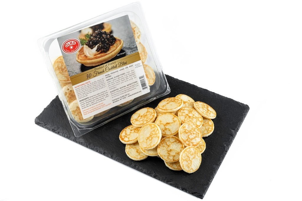 These 16-piece pre-made blini make an easy base for caviar and smoked fish. Best served toasty.