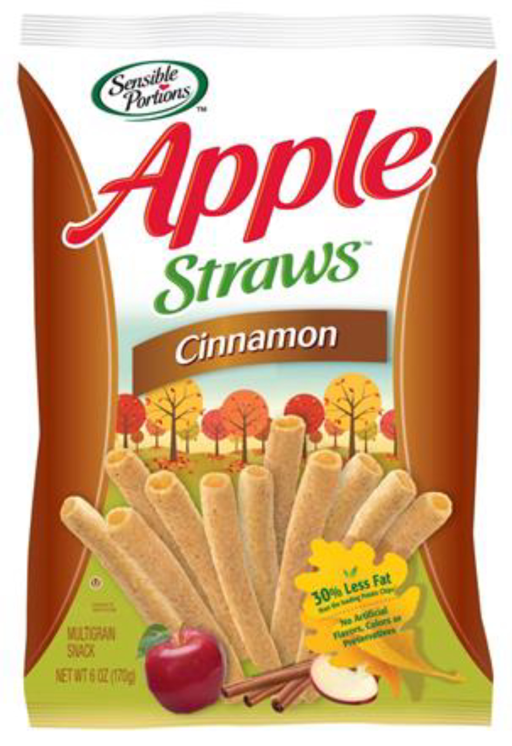 Sensible Portions Cinnamon Apple Straws have the crispy crunch and taste-bud tantalizing flavor you want in a snack, but without all of the artificial flavors and artificial preservatives that you don't. Our multigrain straws are made with puréed apple and sprinkled with ground cinnamon, for a fruity snack that has 30% less fat than the leading brand of potato chips.* With 38 crunch-tastic straws per serving, they're perfect for a satisfying snack or to add a little crunch to lunch. Our straws are delightfully free of genetically modified ingredients, have 0mg cholesterol and 0g trans fat per serving, and they're also Certified Kosher and gluten-free. At Sensible Portions brand, we believe you shouldn’t have to compromise on taste when choosing a better-for-you snack. That’s why each of our products is made with delicious, wholesome ingredients that pack fun and flavor, not artificial preservatives, fillers or artificial flavors. It’s also why we continue to expand our portfolio to offer you and your family a variety of snacking choices that include non-GMO, gluten-free, vegan and organic options. Great for eating on-the-go or in-between meals, we offer something to keep everyone in your family happy and satisfied. Vegan A product that carries an unqualified independent, third-party certification, or carries on-pack statement relating to the product being 100% vegan.