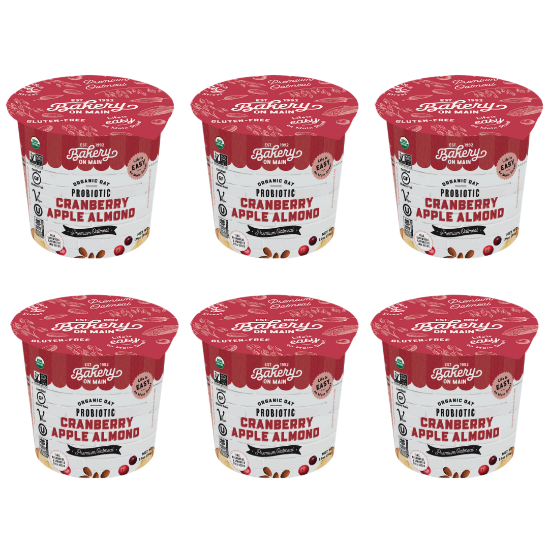 Bakery On Mainâs cranberry apple almond oatmeal cup is made with probiotic cultures and 36g of whole grains per serving. In addition, this oatmeal is USDA organic certified and is a good source of ALA and fiber! About the Brand Founded in 1992, our story began as a bakery inside a small natural foods market on Main Street in Glastonbury Connecticut. Here we discovered our passion for creating delicious gluten-free and celiac-friendly breakfast and snack foods. We pride ourselves on our ability to craft granola, snack bars, and oatmeal that taste just as good (if not better) than our less healthy competitors. Itâs our belief that everyone should be able to enjoy a satisfying meal that doesnât sacrifice taste for wholesomeness. To indulge in a snack thatâs filling and nutritious, a snack that fits perfectly within any individualized dietary wants and needs. Bakery On Main promises simple, effortless eating and snacking, on anybody's terms.