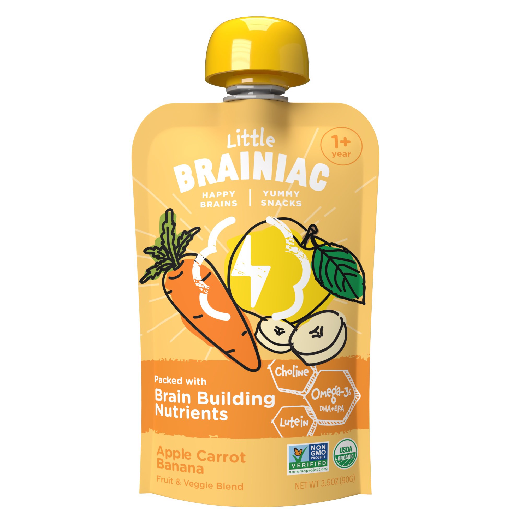 Delicious, organic fruit and veggie pouches packed with nutrients for healthy brain development, healthy vision and a big boost of immunity. Little Brainiac pouches are a smarter snack loaded with the good stuff growing minds need to thrive. - 100% Organic - Excellent source of Vitamin C, Choline, and Vitamin A - 35mg Omega-3s DHA - 110mg Choline - 3mg Lutein - Recipient of The Clean Label Project verification and Purity Award Certification - Brainiac Foods is a Certified B Corporation.