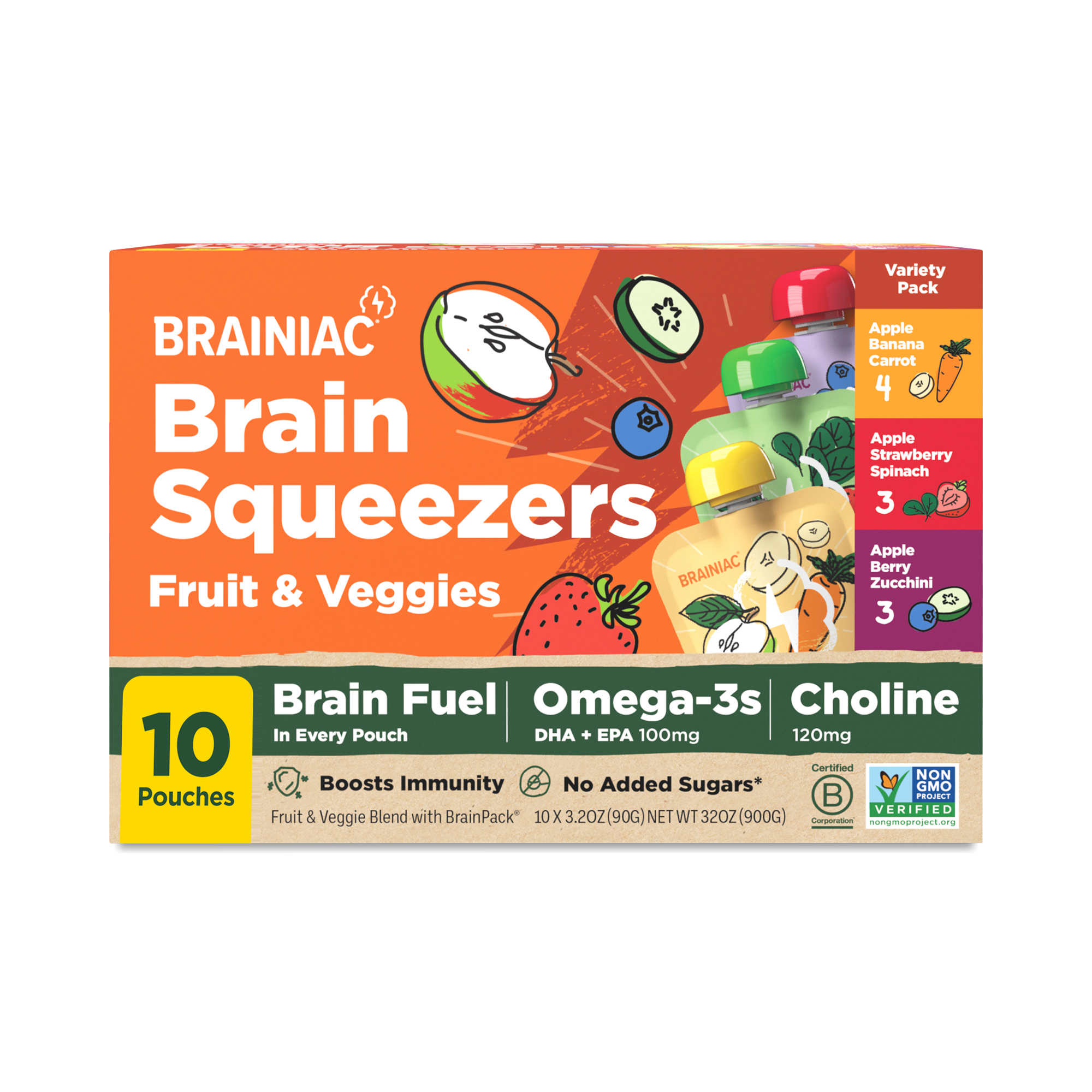 Apple Banana Carrot: Apples, Bananas, Carrots, Citric Acid, Ascorbic Acid (Vitamin C), Lemon Juice Concentrate, Apple Strawberry Spinach: Apples, Strawberries, Spinach, Apple Puree Concentrate, Ascorbic Acid (Vitamin C), Lemon Juice Concentrate, Apple Berry Zucchini: Apples, Blueberries, Zucchini, Apple Puree Concentrate, Strawberries, Ascorbic Acid (Vitamin C), Lemon Juice Concentrate, Brainpack: Omega-3 Dha/Epa (Fish Oil), Natural Flavors, Choline Chloride, Mixed Tocopherols (Vitamin E)