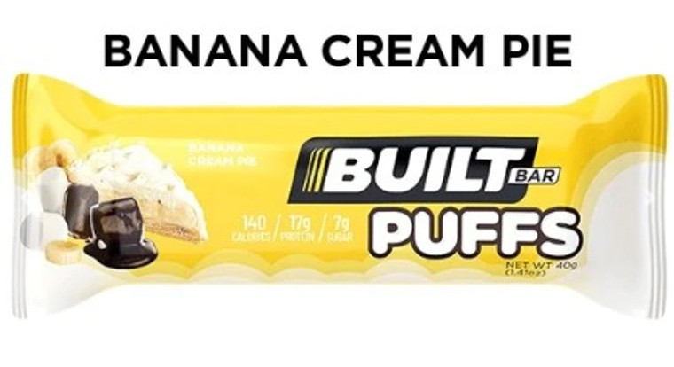 Built Puff (Box of 12) - Banana Cream Pie Get ready for a trip down memory lane, because with our Banana Cream Pie Built Puffs Built has successfully captured the entire experience of biting into a fresh Banana Cream Pie at Grandma's house and wrapped it into one delicious high protein and gluten free snack. The delicious chocolate covered, creamy marshmallow consistency of our Built Puffs combine the taste of perfectly ripe bananas with the experience of biting into the delicious whipped cream and pudding of a fresh baked Banana Cream Pie. And the best part of all, you get all the flavor without any of the guilt since our Banana Cream Pie Built Puffs only have 7g of sugar and 140 calories while still boasting 17g of delicious protein.