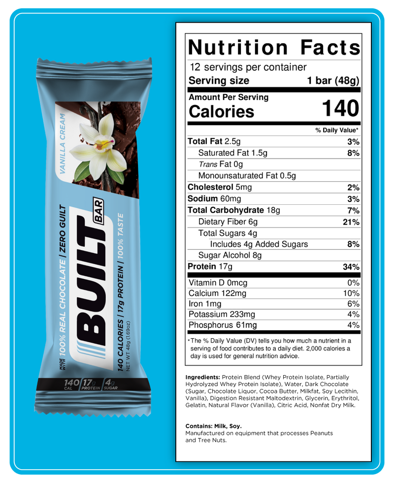 Vanilla or Chocolate, Vanilla or Chocolate, Vanilla or Chocolate. Which would you choose? What if we told you that you could have both? Well, you're in luck, because with this new Vanilla Cream bar perfectly combined the robust flavor of our 100% real dark chocolate with a new delicious creamy vanilla base. Built Bar successfully wrapped the flavor and experience of sitting down at the end of the night with a bowl of your favorite vanilla ice cream, topped with 100% chocolate in a deliciously convenient bar. All of this with only 140 Calories, 4g of Sugar, and a whopping 17g of Protein!