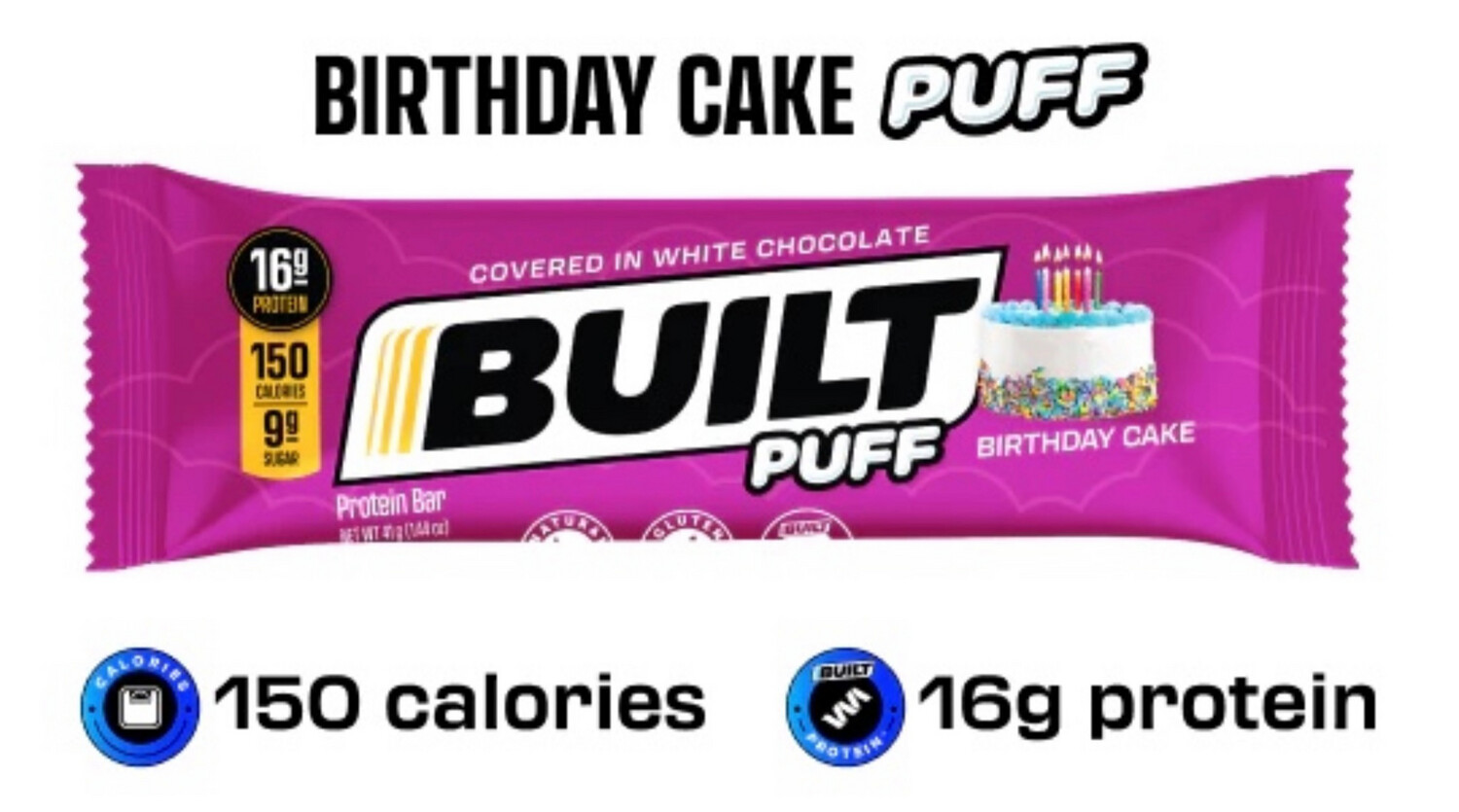 What's better than birthday cake? What about guilt-free birthday cake you can eat everyday? Make everyday your birthday with Built Puffs Birthday Cake bars. We’ve taken the delicious experience of biting into a fresh slice of birthday cake, enrobed it in 100% white chocolate and added sprinkles, plus its a puff!With 150 calories, 16g protein and only 9g sugar this limited time flavor is an amazing option if you are looking for a healthy way to get flavor and variety in your snacks. Built Bar Protein Puffs - Birthday Cake Highlights:. . . . Contains: Milk, Soy. Manufactured on equipment that does not process Peanuts or Tree Nuts. Natural Flavoring and ColoringBuilt Bar only uses natural flavors and natural colors. Built Bar is truly a standout among protein bars. With its exceptional nutritional profile and so many delicious flavors, Built Bar is the favorite protein bar of many discerning fitness trainers and fitness enthusiasts alike.