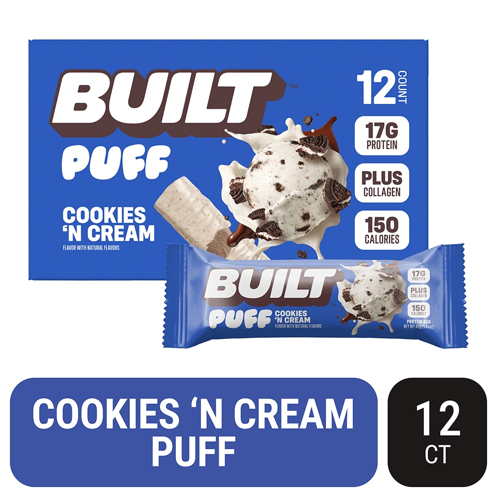 Indulge in the classic taste of BUILT's Cookies 'N Cream Puff Protein Bar, the ultimate treat for cookie lovers. This light and fluffy delight delivers the nostalgic flavor of cookies and cream you crave, without the need for a glass of milk. Packed with high-quality protein, collagen, it’s perfect for a post-workout snack, a midday energy boost, or a guilt-free dessert. Our Cookies 'N Cream Puff Protein Candy Bar is designed for fitness enthusiasts, busy professionals, and anyone looking for a delicious and nutritious way to fuel their day. Each bar is made with premium ingredients, ensuring you get a healthy snack that supports your active lifestyle. With its irresistible taste and convenient packaging, it’s an ideal addition to your gym bag, office drawer, or on-the-go routine. Think you can't have your cookie and eat it too? Think again!