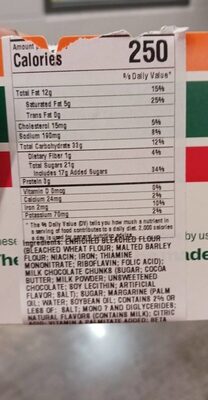 Enriched Bleached Flour (Bleached Wheat Flour, Malted Barley Flour, Niacin, Iron, Thiamine Mononitrate, Riboflavin, Folic Acid), Milk Chocolate Chunks (Sugar, Cocoa Butter, Milk Powder, Unsweetened Chocolate, Soy Lecithin, Artificial Flavor, Salt), Sugar, Margarine (Palm Oil, Water, Soybean Oil, Salt, Mono and Diglycerides, Natural Flavors (Contains Milk), Citric Acid.