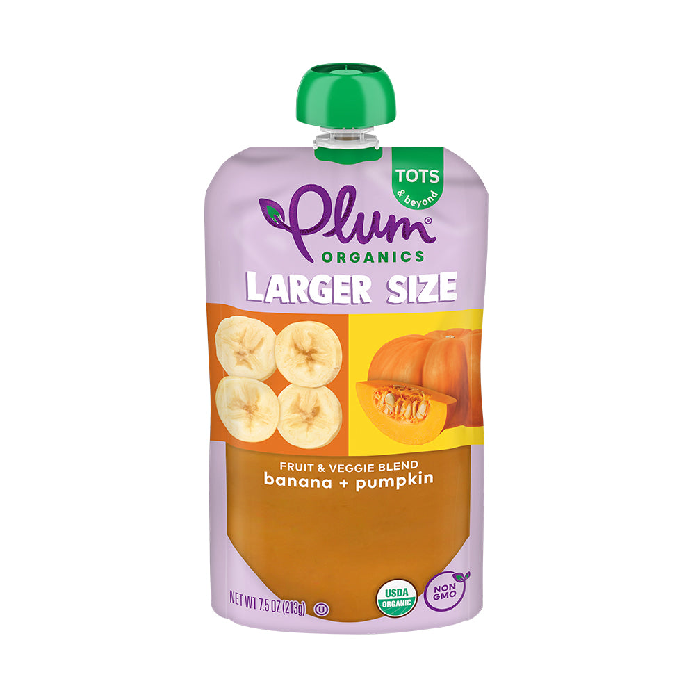 Plum Organics® fruit and veggie blends are made for tots ages 12 months and up. With blends of pure fruit and veggies, our fruit and veggie blends are perfect for exposing your little foodie to unique flavors and colors. Our Banana & Pumpkin blend uses only Non-GMO, organic ingredients that both you and your little one will love. The blends are naturally preserved, unsalted, unsweetened, and kosher pareve. And since our pouches are resealable, you can customize portion sizes that are perfect for your growing baby. At Plum Organics®, we're not just delivering nourishing, organic blends to your little ones..we're making the world a better place! Our Non-BPA pouches have a smaller overall environmental footprint than glass jars, using less energy and generating less greenhouse gases during their lifecycle. While there is no recyclable pouch film in existence yet (we're working on it!), the caps on our pouches are recyclable and help to prevent food waste. By using our pouches, you're sharing in our commitment to leaving a baby-sized footprint on the planet.