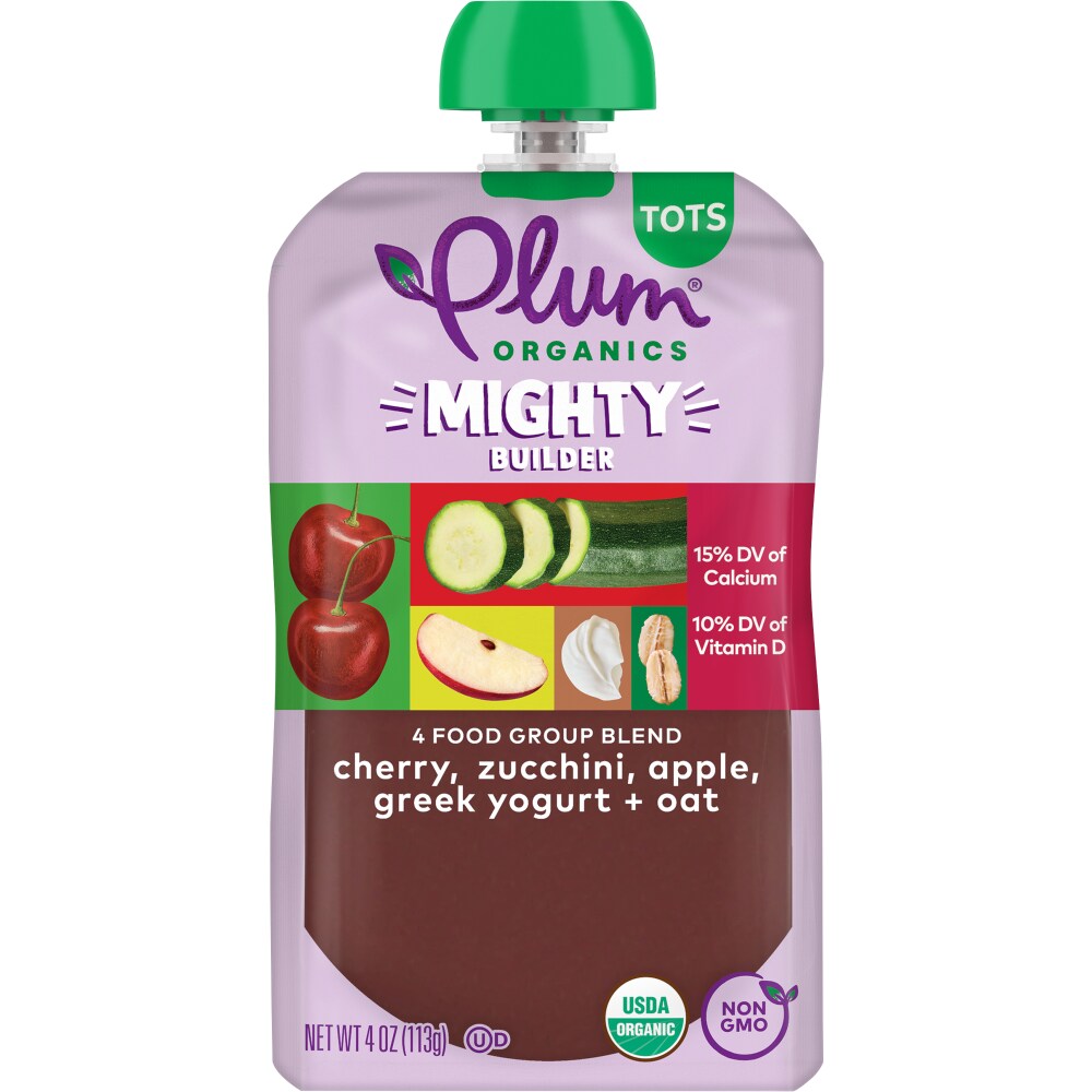 Plum Organics® Mighty Builder pouches provide fruit & veggie blend from organic veggies fruits and seeds and are the perfect on-the-go snack for your toddler. Every pouch contains essential nutrients to fuel your active tot and introduces them to new and unique flavors. They will love this blend of Cherry Zucchini Apple Greek Yogurt + Oat! Using only Non-GMO organic ingredients the blends are unsalted unsweetened and kosher pareve. And since our pouches are resealable you can customize portion sizes that are perfect for your little one.