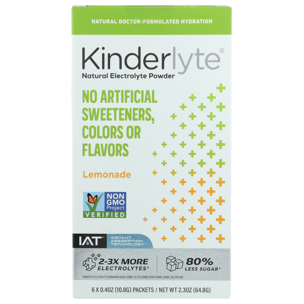 Kinderlyte Natural Electrolyte Powder Drink Mix was developed by doctors and dietitians dedicated to formulating a true Oral Electrolyte Solution (OES) with more electrolytes, potassium, and zinc than the leading brand. Kinderlyte is a non-GMO, vegan, gluten-free, fructose-free alternative to conventional electrolyte solutions.