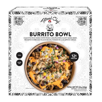 Tattooed Chef Burrito Bowl Tasty, plant-based, and with just the right amount of spice. This bowl features cilantro rice, riced cauliflower, plant-based beef, roasted corn, and black beans in a jalapeño crema. A vibrant, flavor-packed meal thatâs quick and easy to enjoy, offering a delicious and satisfying option for any time of day.