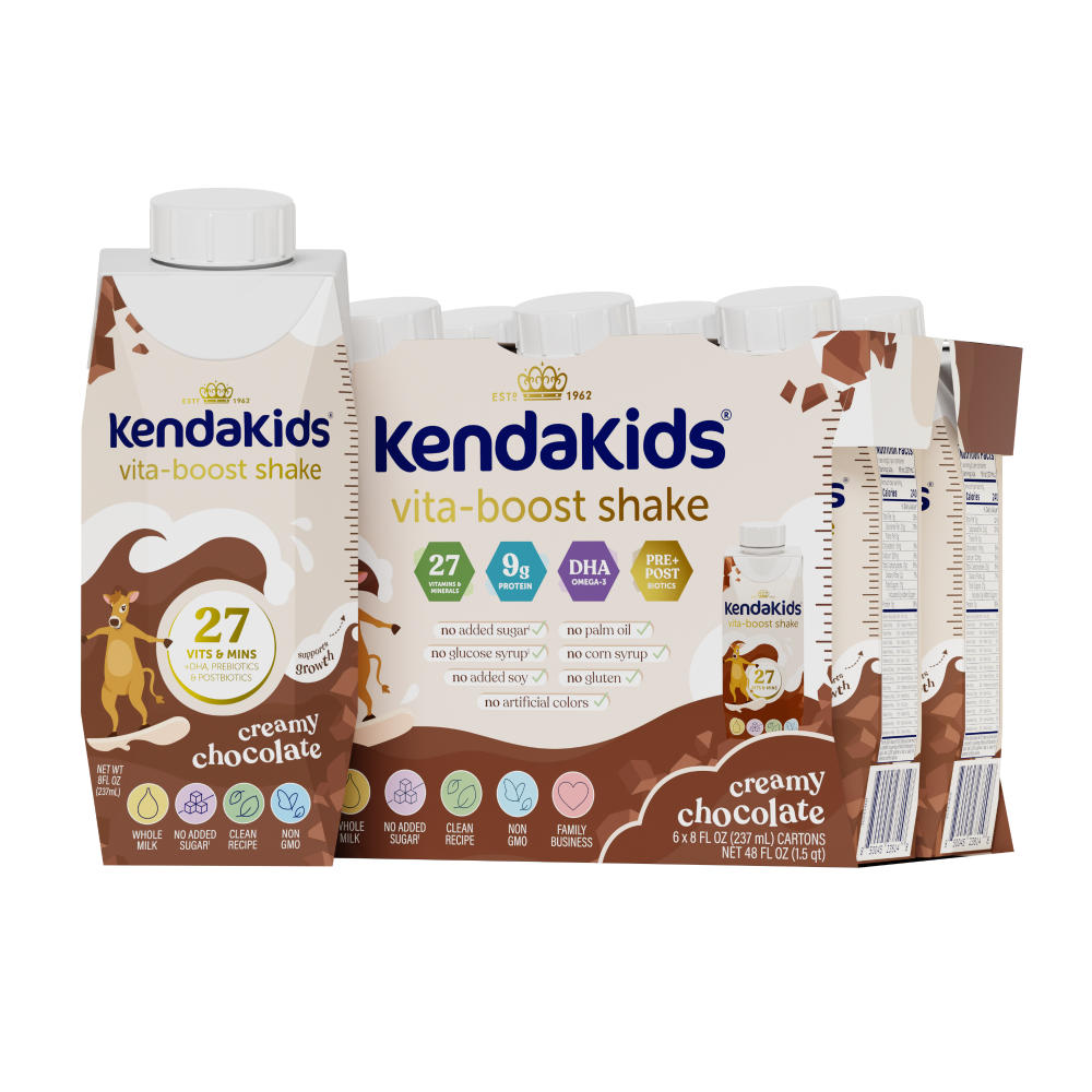 KendaKids Vita-Boost Shakes are made with European whole milk from grass-fed cows raised on family farms. Each shake is enriched with 27 essential vitamins and minerals, delivers 9g of protein, 32g of plant-based DHA Omega-3s, and a unique blend of prebiotics and postbiotics to support immune function, muscle growth, brain development, and gut health. Good milk fats further support your kids’ growing brain, while Vitamin D helps boost calcium absorption for strong bones and teeth. And the best part? They’re free from added sugars, syrups, artificial flavors, and colors. Every sip delivers the natural goodness your child needs- and nothing they don’t.