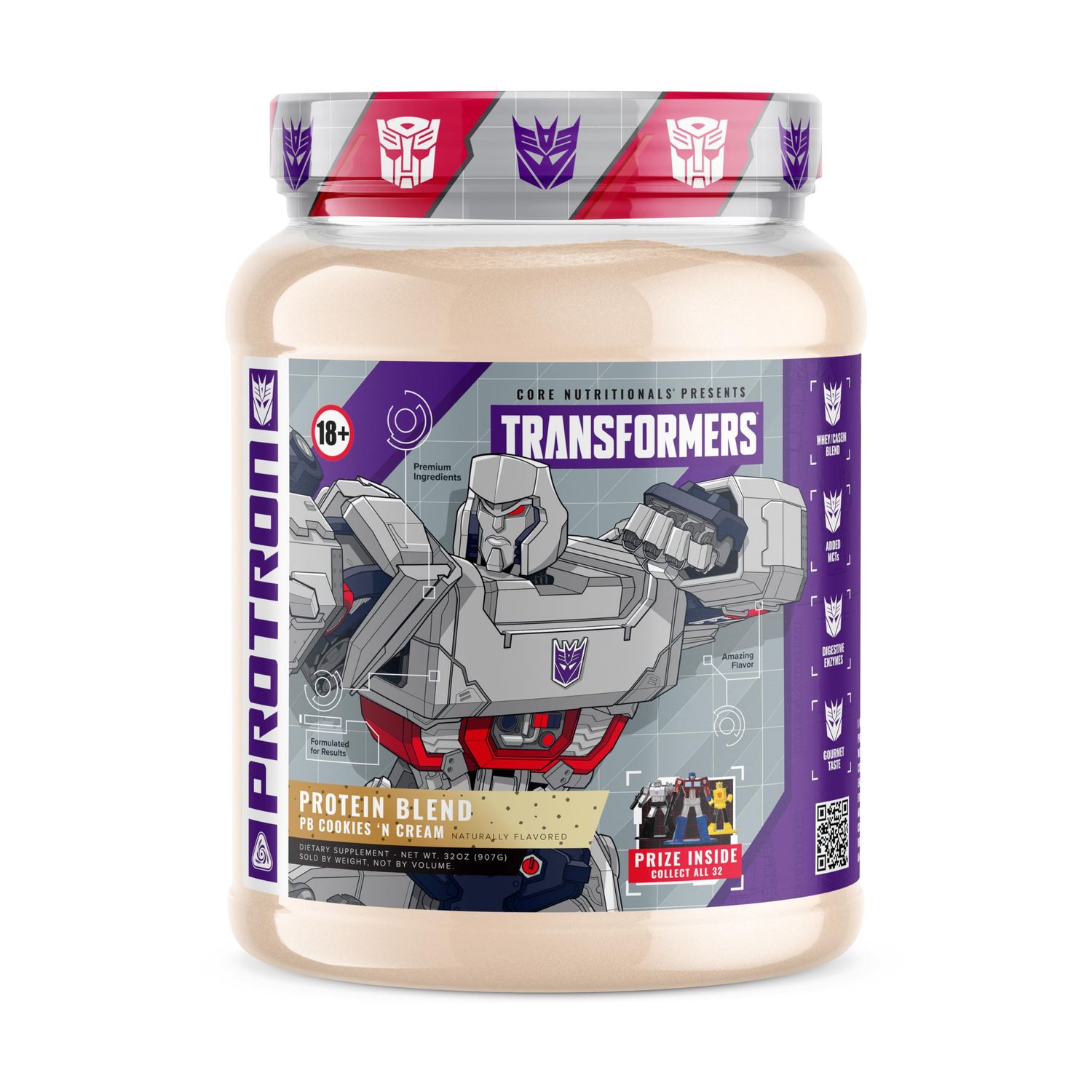 Introducing Protron, the ultimate protein blend designed for any machine. Packed with a high-quality whey and casein protein blend, MCTs and digestive enzymes, the Protron supplement is designed to fuel your inner Autobot. Whether youre ready to ramp up for battle or start the recovery process post workout, Protron can help you harness your power within.