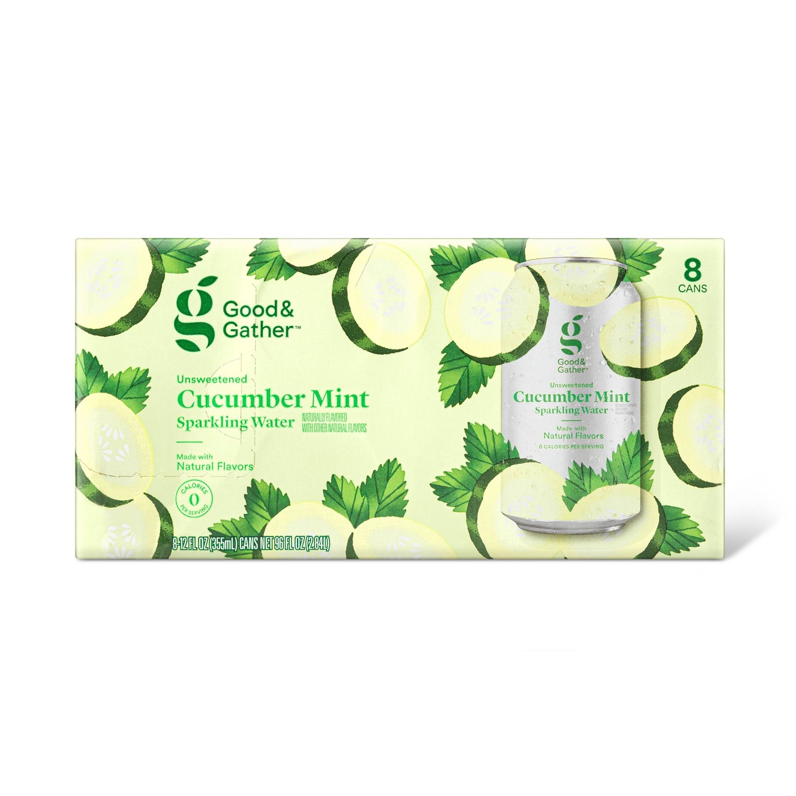 Quench your thirst and invigorate your senses with the Cucumber Mint Sparkling Water from Good & Gather™. Each can in this eight-pack contains a deliciously refreshing cucumber-mint taste, giving you a mouthwatering delight to enjoy any time you're looking for a beverage. Unsweetened and made with natural flavors, this cucumber-mint carbonated water also contains zero calories, making it the perfect way to relish in a fizzy, satisfying refreshment. With eight cans, you can add one to your lunch for work or school, take to a picnic on a hot day or combine with other flavored sparkling water packs for guests to enjoy a cool drink at a party. You can even create a family-friendly punch or mocktail by mixing this cucumber-mint fizzy water with fresh mint and cucumber slices, and a splash of fresh lime for added tang. Every product that carries the Good & Gather™ name starts with quality ingredients that deliver great taste, making it easier for you and your family to eat well, every day. We promise you’ll love each bite, or your money back.