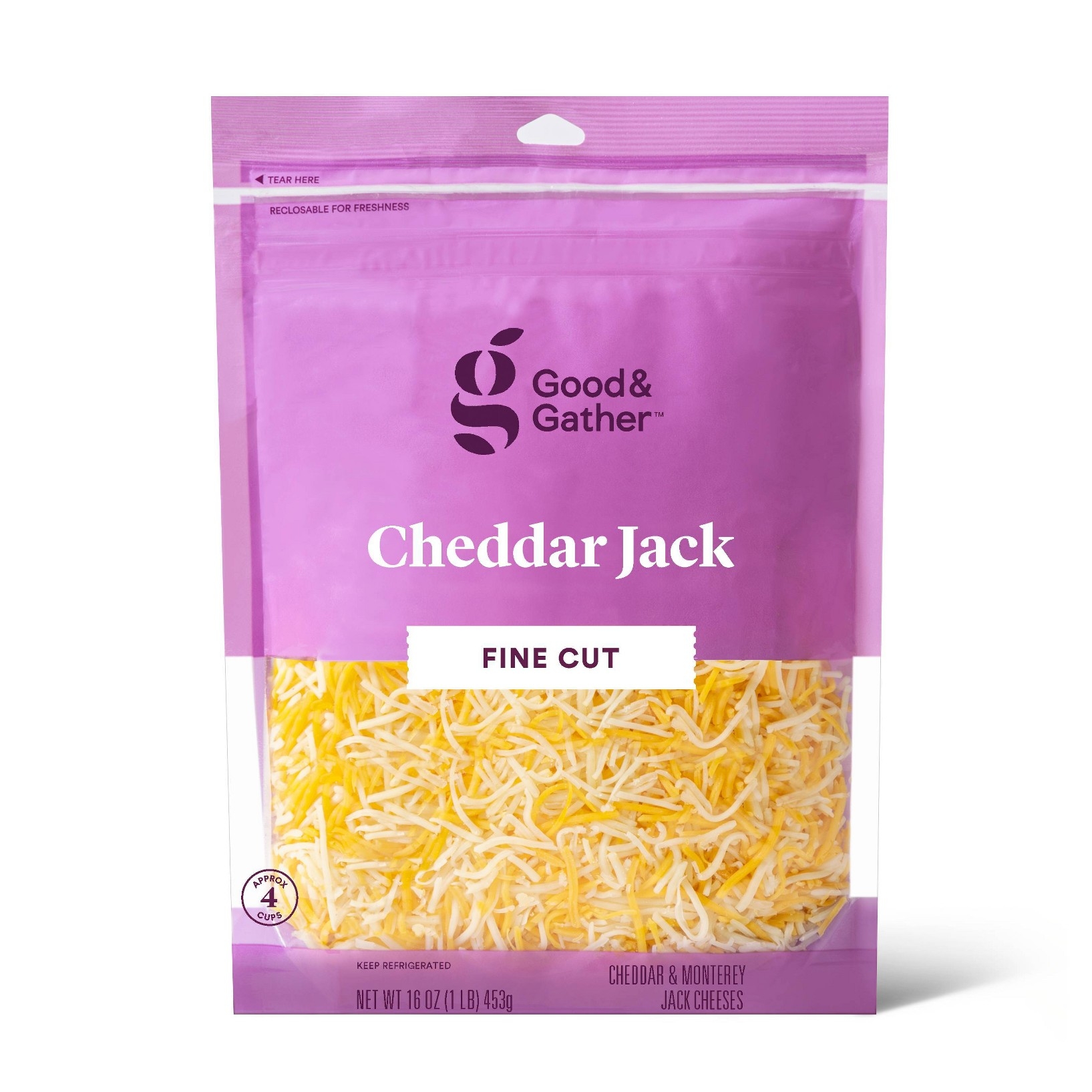 Whether you're whipping up your signature chili, homemade broccoli-cheddar soup or classic baked potatoes, Finely Shredded Cheddar Jack Cheese from Good & Gather™ will give your dish the perfect finishing touch. This finely shredded cheese is a tasty combo of cheddar and Monterey jack cheeses that adds delicious, mild flavor to anything you add it to. This pack of shredded cheese includes 16 ounces — approximately four cups — of cheese so you have plenty for multiple meals, and the package is reclosable to keep the cheese fresh between uses. However you choose to serve it, you'll appreciate that this shredded cheese is a good source of calcium*.*See nutrition for fat and saturated fat content. Every product that carries the Good & Gather™ name starts with quality ingredients that deliver great taste, making it easier for you and your family to eat well, every day. We promise you’ll love each bite, or your money back. All Good & Gather products are made without artificial flavors, synthetic colors, artificial sweeteners, and high-fructose corn syrup. Some are specially formulated while others never contained these ingredients.