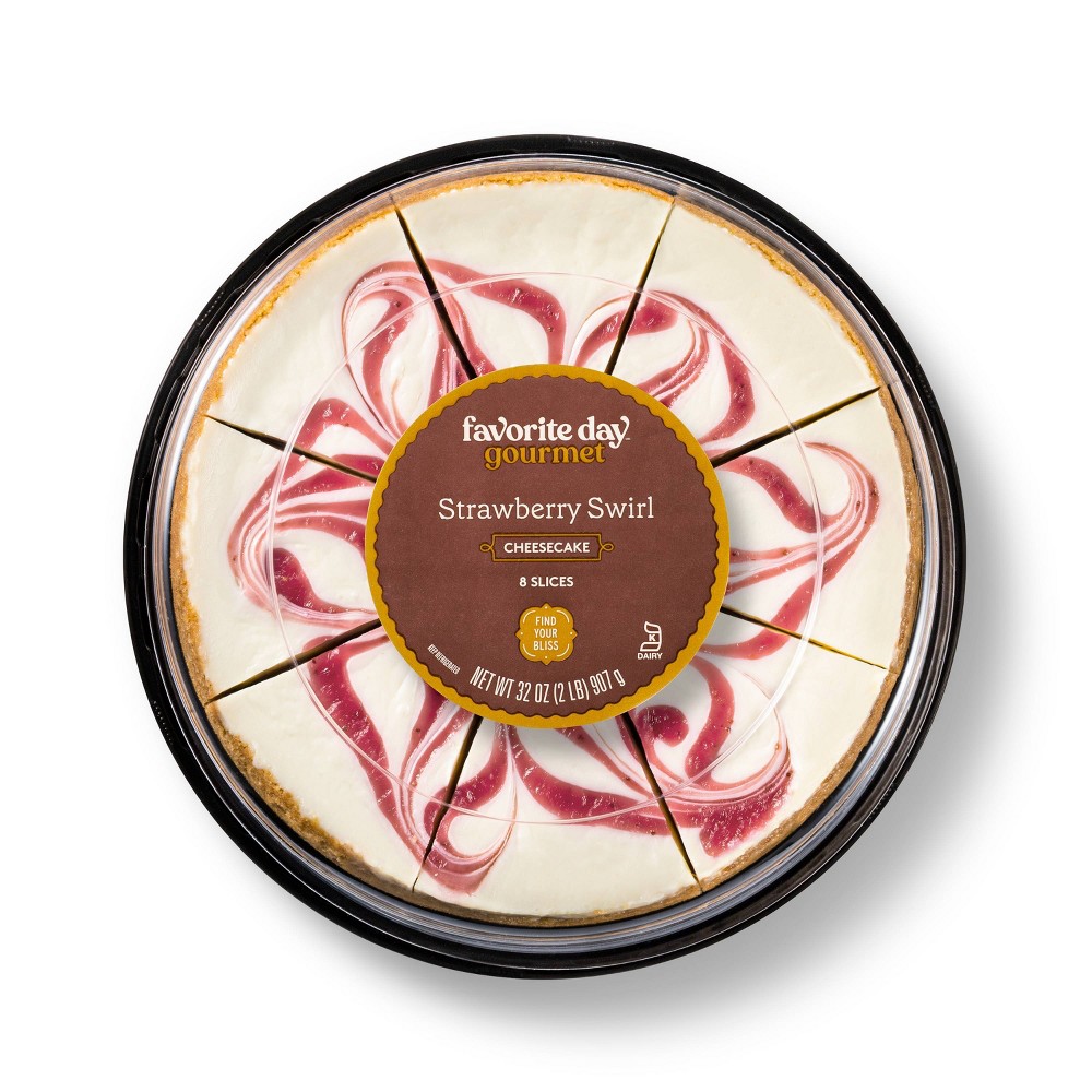 Sweeten up your day when you enjoy a slice of Strawberry Swirl Cheesecake from Favorite Day™. This cheesecake serves up eight slices, giving you plenty to share or to treat yourself over multiple days. A classic vanilla cheesecake is taken to the next level with a deliciously sweet strawberry swirl throughout and a delicious, crumbly graham cracker crust for a dessert that's sure to delight. Delightful on its own, you can easily take this cheesecake to the next level by topping with cut-up strawberries or a drizzle of chocolate sauce. A little bliss in every bite. Guaranteed to be a favorite or your money back.