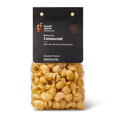 For a delicious dish the whole family will love, reach for a package of Signature Lumaconi Pasta from Good & Gather™. Imported from Italy and made with 100% durum wheat semolina, this lumaconi pasta comes in an extra large shell shape for a hearty bite that's great for stuffing with your favorite fillings, and the bronze cut gives it a slightly coarser texture that helps sauces cling for rich flavor bite after bite. The pasta is made with no partificial flavors, preservatives or synthetic colors.