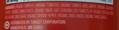 Organic Tomatoes (Organic Tomatoes, Organic Tomato Juice), Water, Organic Jalapeno Peppers, Organic Tomato Paste, Organic Onion, Salt, Contains Less Than 2% of Organic Distilled Vinegar, Organic Cane Sugar, Organic Cayenne Pepper, Organic Dried Onion, Organic Dried Garlic.