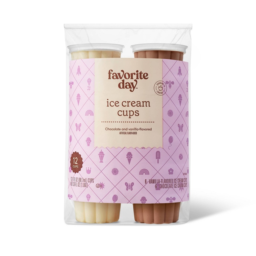 Whether you're packing a family picnic or just looking for a convenient way to serve an after-dinner dessert, these Chocolate & Vanilla Flavored Ice Cream Cups from Favorite Day™ make for an easy and delicious way to serve up a cold, creamy treat everyone will love. This 12-pack of ice cream cups includes six vanilla flavor and six chocolate flavor cups, giving you options so everyone can enjoy their favorite flavor. In a convenient cup format that's great for serving at birthday parties, cookouts and more, these tasty treats offer an easy way to serve cold and creamy ice cream that's sure to delight. A little bliss in every bite. Guaranteed to be a favorite or your money back.