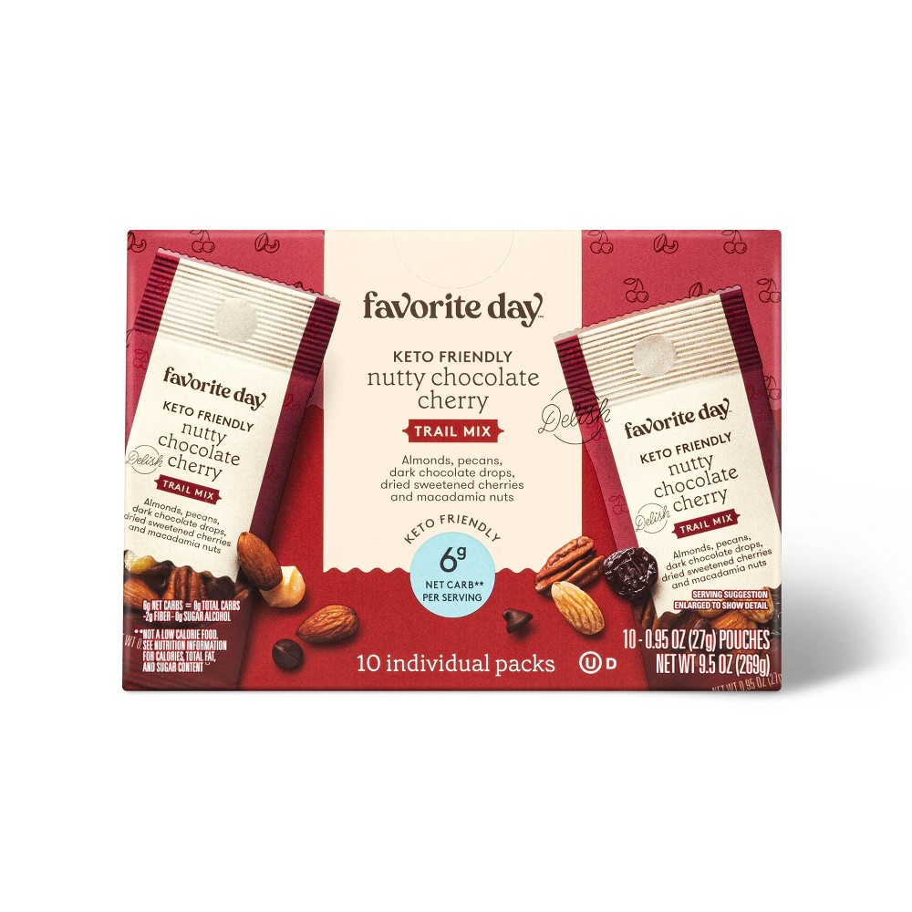 It's easy to satisfy your snack craving with the 10-Count Multipack of Nutty Chocolate Cherry Trail Mix from Favorite Day™. This pack of trail mix comes with 10 individual pouches for pre-portioned servings that are perfect for a grab-and-go snack or an addition to a lunch. The trail mix features a delicious medley of almonds, pecans, dark chocolate drops, dried sweetened cherries and macadamia nuts, making for a sweet and savory mouthful you'll love — all while being keto friendly and kosher. Enjoy a pouch on its own anytime during the day. A little bliss in every bite. Guaranteed to be a favorite or your money back.