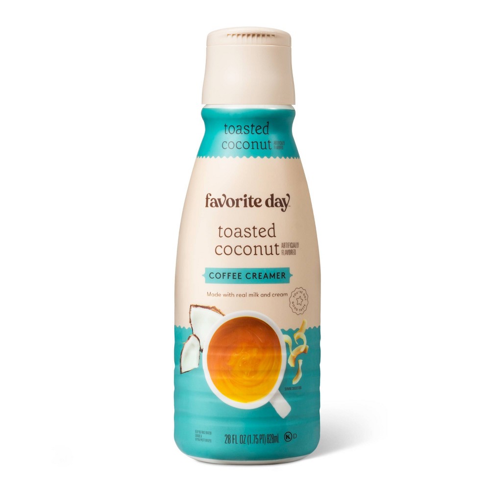 If you're looking for a tasty way to add some flair to your morning coffee routine, look no further than this Toasted Coconut Coffee Creamer from Favorite Day™. Made with real milk and cream, ultra-pasteurized and Kosher, this creamer features a delicious, artificially flavored toasted coconut taste. Great for pouring directly into black coffee, it can also be added to espresso to make hot or iced coconut lattes, or you can add some to tea for a creamier cup. The 28-ounce bottle offers you plenty of servings, so you can enjoy cafe-quality drinks again and again at any time of day.