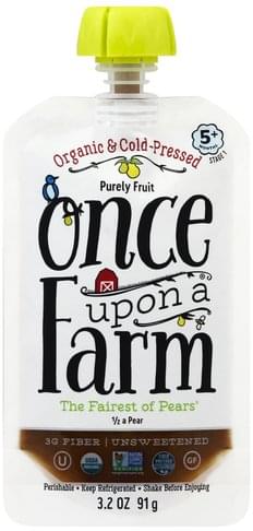 1/2 pear. Organic & cold-pressed. 18% protein. Unsweetened. USDA organic. Non GMO Project verified. nongmoproject.org. Cold pressed protected. Gluten free. We make homemade so you don't have to. Giving our little ones a taste for good food welcomes a lifetime of eating that takes joy in real food, picked from rich soil, clear water, bright air. First meals matter. The bee pollinated all the fields. Unlike shelf stable pouches that use high heat, our food is cold-pressed using HPP to maintain a higher nutrient content & fresher, less sugary flavors. No preservatives, concentrates, or processed purees. Organic, non-GMO & gluten free. BPA-free pouch recyclable via Terracycle. Pediatrician recommended. Just like homemade, without all the fuss. We only use fresh, whole pears, instead of processed purees. Let's choose convenience without compromise. At-hand, baby-balanced recipes, fresh from farm to high chair, with nothing added, subtracted or distorted. So we don't have to give anything up, and neither do the little ones we love. Let's start from the beginning, without starting from scratch. The end. Time to eat! Certified organic by CCOF. Visit us at www.uponafarm.com. Our less processed ingredients means flavors may vary a bit from batch to batch.