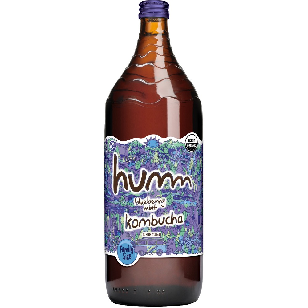 USDA organic. Certified organic by Oregon Tilth. Gluten free. Contains 8% juice. Organic Raw Kombucha with 5.7 Billion probiotic cultures (at the times of bottling) (contains a trace amount of alcohol). You have 40 ounces of Kombucha goodness in your hand. It's the same raw, authentic Kombucha found in our 14 oz. bottles brewed in Bend, Oregon with delicious organic ingredients and probiotics. What will you do with 40 ounces of Humm? Serve it up as an after school snack. Add it to your breakfast smoothie. Fill your canteen before a hike. Share with the whole family. Hydrate after a workout. Mix up a new cocktail. Bring the hippest NonAlc to the party. Verified Non Alcoholic (NA). GMO-free. Learn more ate humm.com. Please recycle.
