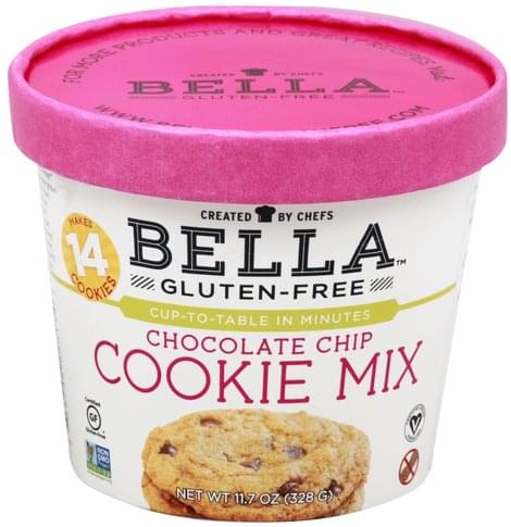 Makes 14 cookies. Gluten free. Certified gluten free. Certified vegan. Vegan.org. Created by Chefs. Cup-to-table in minutes. Non GMO Project verified. nongmoproject.org. For more products and great recipes, visit www.bellaglutenfree.com. Manufactured in a dedicated gluten-free facility in Idaho. Three chefs started Bella Gluten-free with a desire to create beautiful food that's simply delicious. Our cup-to-table mixes are a gift to the quick gourmet. Enjoy allergen-friendly and non GMO ingredients, great taste, and heavenly texture in minutes. Made in the USA.