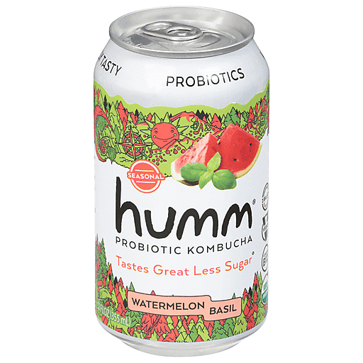 USDA Organic. Certified Organic by Oregon Tilth. Vegan. Less sugar (46% less sugar than the leading Kombucha brand). 2 billion probiotic cultures (At the time of canning). Vitamin B12. Absurdly tasty. Probiotics. Tastes great. Yep, we did it. We figured out how to can the tastes of summer; juicy watermelon and delectable basil, with 2 billion probiotics to balance your belly and B12 vitamins for those long, hot days. hello, summer. Verified non-alcoholic (Contains less than 0.5% alcohol). humm.com. Please recycle.
