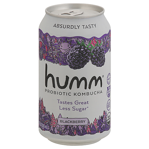 USDA Organic. Vegan. Less sugar (37% less sugar than the leading Kombucha brand). 2 billion probiotic cultures (At the time of canning). Vitamin B12. Absurdly tasty. Probiotics. Tastes great. So, you've got a bottle of Humm in your hands. That must mean you think things that are good for you should also taste great. You're one smart cookie. Wondering what Blackberry Humm tastes like? Imagine the purple stains on your fingers on a summer day by the lake when you were 8. It's that. Verified non-alcoholic (Contains less than 0.5% alcohol). humm.com. Please recycle. We're sustainable!