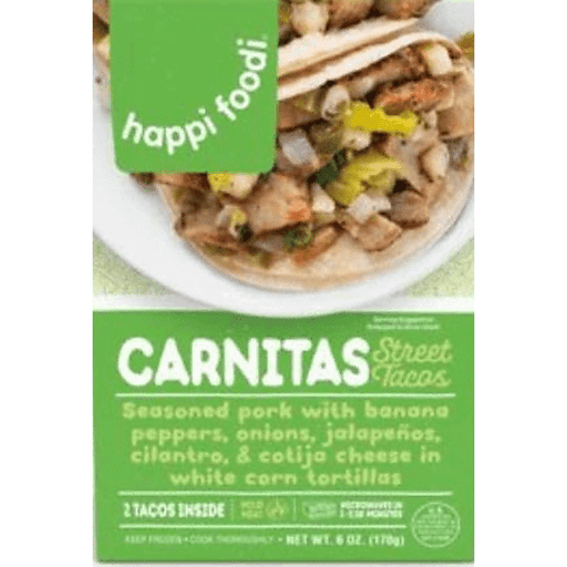 - The manufacturer of Seasoned Pork with Banana Peppers, Onions, Jalapenos, Cilantro, & Cotija Cheese in White Corn Tortillas Street Tacos, Carnitas is Happi Foodi.