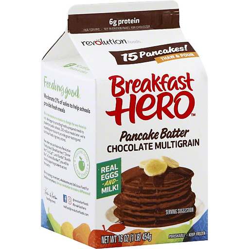 15 pancakes! Thaw & pour. Real eggs and milk! 6 g protein per serving - See nutrition panel for cholesterol content. Breakfast Hero to the rescue! Make hot pancakes in a flash - no super powers required. No artificial flavors or colors. Feeding good. We donate 1% or sales to help schools provide fresh meals. We're two moms on a mission to change the way America eats. We began by providing freshly-prepared meals to students in public schools. 200 million meals later, we're expanding our mission to provide great-tasting and nutritious foods in grocery stores. Now, when you purchase any Revolution Foods product (Breakfast Hero, Dinner Hero, In a Cup!, Lunch Bundle, Bundle Box or Granola Bundles) you will be directly supporting students across the country. We're creating convenient, wholesome and delicious food for families everywhere. Join our revolution to make a difference! - Kristen & Kirsten, founding moms. Facebook. Instagram. at revolutionfoods. hashtag breakfasthero. 13 g whole grains. Certified B corporation.
