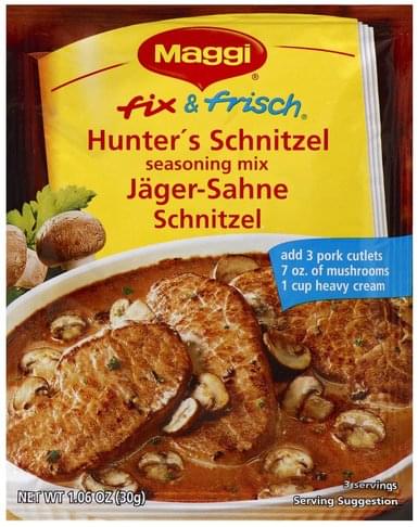 Maggi Fix & Frisch Hunters Schnitzel Seasoning Mix (Jager-Sahne Schnitzel) in 1.06oz (30g) sachet.Serving for 3. Add 3 pork cutlets, 7 oz of mushrooms and 1 cup sweet cream and Maggi Hunters Schnitzel Seasoning Mix to create delicious Jager-Sahne Schnitzel. Product of Germany.