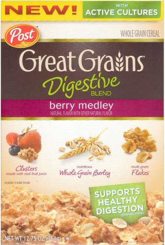 Post Great Grains Digestive Blend Berry Medley. Delicious whole grain wheat flakes, whole grain barley and whole grain oats are combined with nutritious granola and sweetened with a hint of berry juice. Active Cultures Probiotics deliveries good bacteria to help support digestive health.