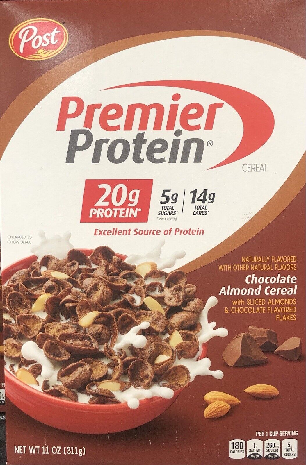 Start your morning strong with Post Premier Protein Chocolate Almond Cereal. When you pour yourself a bowl of ready-to-eat Premier Protein Chocolate Almond Cereal you really are making breakfast the most important meal of the day. Fill your mornings with delicious chocolate flavored cereal flakes mixed with real sliced almonds for a tasty crunch that is sure to leave you satisfied after every bite. This Premier Protein cereal contains 5 grams of sugar and 20 grams of protein per serving making it an excellent source of protein that helps you feel full and ready to start your day. Take on whatever comes your way with Post Premier Protein Chocolate Almond Cereal. Pour a bowl in the morning and enjoy this protein cereal at breakfast or grab a handful as a quick sweet snack to curb late night cravings. You can even mix the chocolate flavored protein cereal flakes with nuts and raisins to make a protein packed trail mix. Feel good about great taste with Post Premier Protein Chocolate Almond Cereal.
