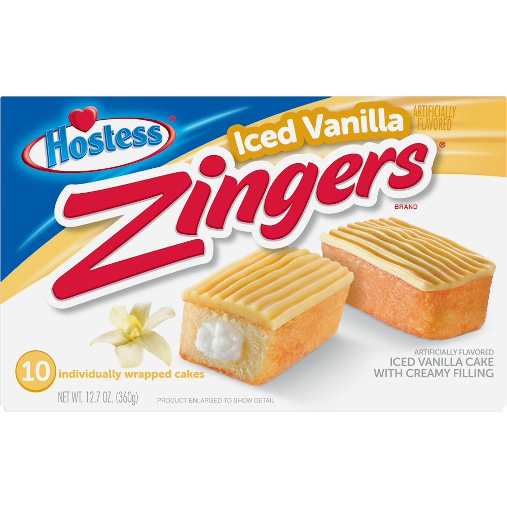 Zinger is the name of the glazed Twinkie with wonderful vanilla filling, topped with a layer of vanilla glaze. After a bite, you will definitely want to eat the entire package. The Vanilla Zingers have a thick layer of icing on top with creamy non-dairy filling in the middle.