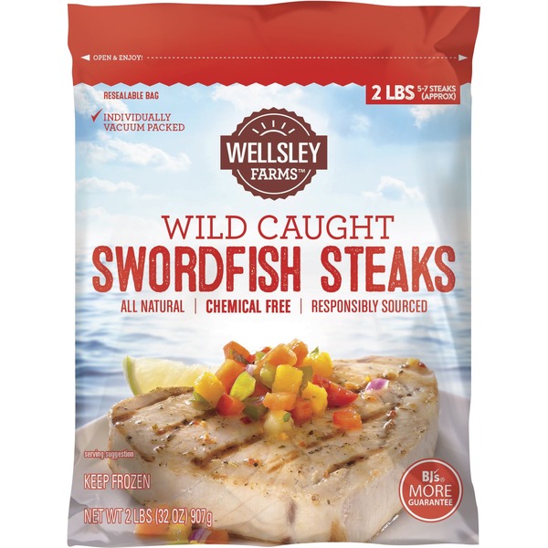 Wellsley Farms Wild-Caught Swordfish Steaks are skinned, deboned and trimmed into perfectly-sized portions. Enjoy these protein-rich steaks drizzled with a marinade, dusted with a rub, or cubed for a kabob. Each serving contains 896mg of omega-3 fatty acids.
