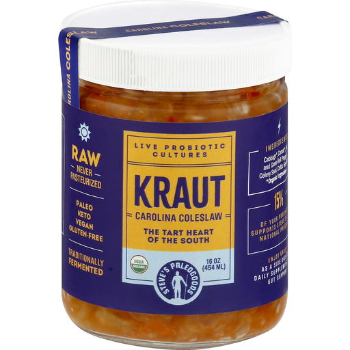 USDA Organic. Certified Organic by PCO. Vegan. Gluten-free. Paleo. Keto. Live probiotic cultures. The tart heart of the south. Long before we became Steves PaleoGoods, we had one goal; to create a healthy snack for the kids of Steves Club, our non-profit that provides fitness, nutritional guidance and personal development to at-risk youth. From that vision, the original PaleoKit was born. Since that day in October 2007, we have devoted ourselves to creating delicious, Paleo-friendly goods and using the proceeds to fund the Steves Club National Program. Thanks for your support! Enjoy Kraut as a side dish or daily supplement for gut support. stevespaleogoods.com. 15% of your purchase supports Steve's Club National Program.