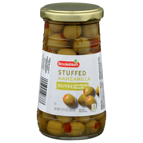 25 calories per 5 olives serving. If you're not happy, we're not happy - 100% satisfaction, 100% of the time, guaranteed! brookshires.com. Questions? Call us at 1-903-534-3000; brookshires.com. Non-BPA intent lid. Product of Spain.