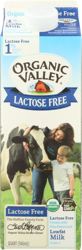 USDA Organic. Oregon Tilth Certified Organic. Low fat. Lactose free. 1% milkfat. Vitamin A & D. Excellent source of calcium. Organic is always non GMO. Ultra pasteurized. Pasture-raised. Homogenized. Easy to digest. The Vosberg family farm. Heidi Vosberg, Organic Valley farmer-owner.