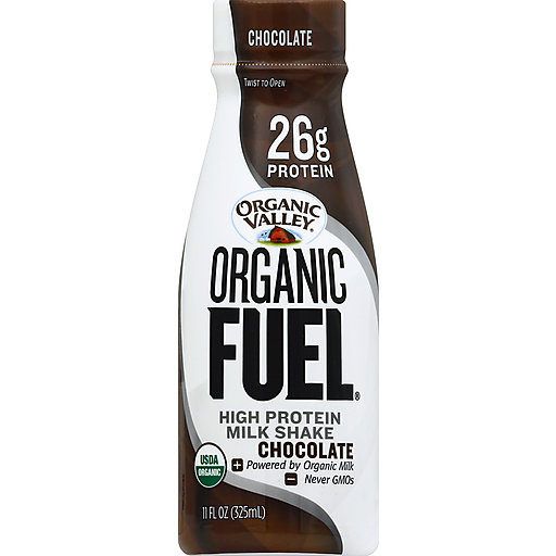 ORGANIC VALLEY ORGANIC FUEL HIGH PROTEIN MILK SHAKE, CHOCOLATE IS GLUTEN-FREE, LACTOSE-FREE, KOSHER, NON-GMO AND ORGANIC. IT HAS 26 G. OF MILK PROTEIN. THIS MILK COMES FROM COWS NEVER TREATED WITH ANTIBIOTICS OR SYNTHETIC HORMONES, COWS THAT HAVE THE OPPORTUNITY TO LIVE IN PASTURES AND FEED ON GRASS, WHICH HELPS CREATE A BETTER, FRESHER MILK. EACH BOTTLE CONTAINS 11 FL. OZ. OF CHOCOLATE MILK SHAKE.