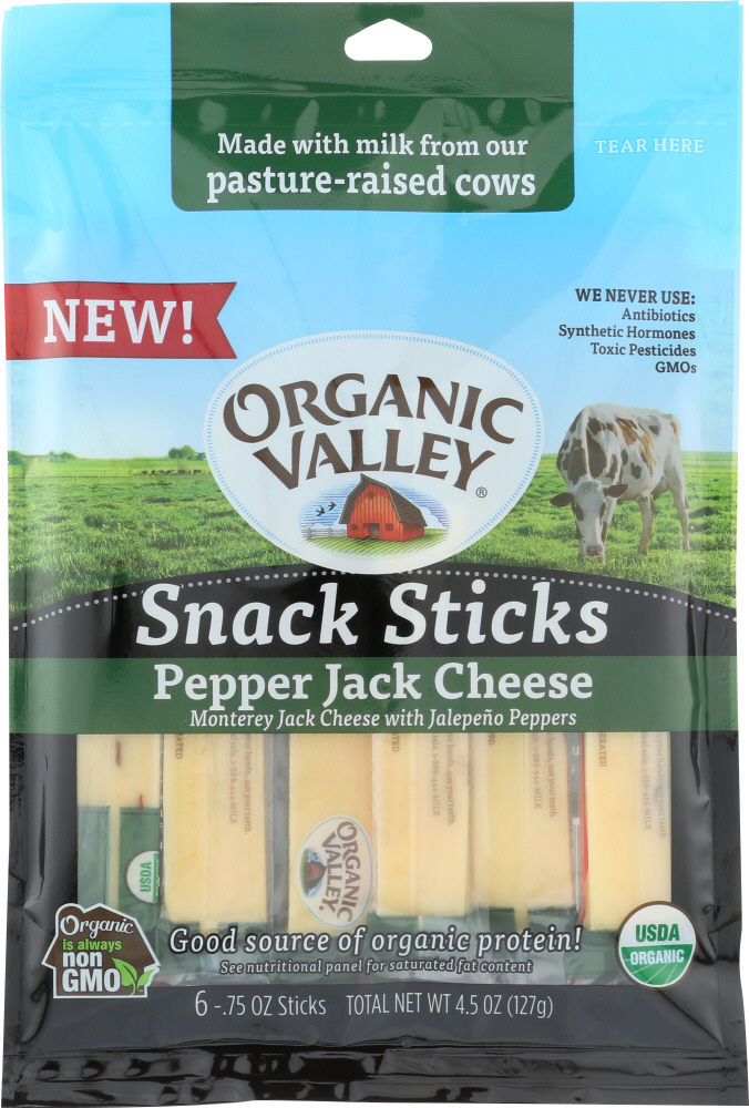 - The manufacturer of Pepper Jack Monterey Jack Cheese with Jalapeno Peppers Snack Sticks, Pepper Jack is Organic Valley.