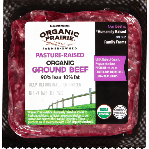 - The manufacturer of 90% Lean/10% Fat Ground Beef is Organic Prairie.