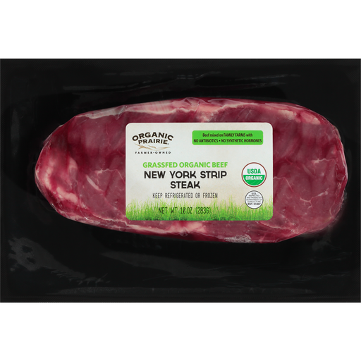 - The manufacturer of Grassfed Organic Beef New York Strip Steak is Organic Prairie.