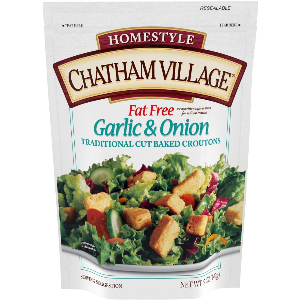 Chatham Village® Fat Free Garlic & Onion Traditional Cut Baked Croutons. Resealable. Zip-Pak®. Homestyle. See nutrition information for sodium content. Net wt 5 oz (142g). Chatham Village® croutons originated in a tiny sandwich shop nestled in the town of Chatham, Massachusetts on the elbow of cape cod. It was there that a great tradition of baking the freshest breads, rolls and unique homemade croutons was born. Today the tradition still lives as we continue to use our signature, twice-baked process to create the freshest tasting, most deliciously crunchy croutons. First, we bake our made-from-scratch French bread dough. After the rich, crusty loaves cool, we cut them to size, season them with our special seasoning blend, and then bake them to perfection to seal in that exceptional Chatham Village flavor. Enjoy Chatham Village croutons on salads, in soups or as a perfect snack. Try our traditional cut or any of our large cut varieties for the ultimate in crunchiness. Chatham Village croutons are made with quality ingredients for the finest eating experience. Produced with genetic engineering. Questions or comments 1-888-254-0850. www.chathamvillageco.com. ©T. Marzetti Co. Zip-Pak®, the Zip-Pak Logo® and the Color Line Design® are registered trademarks of ITW.