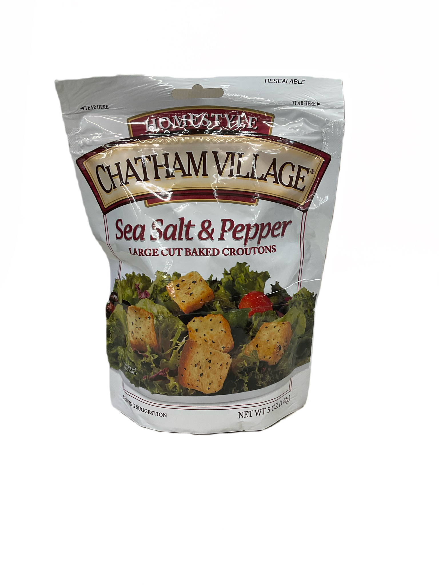 Chatham Village® Sea Salt & Pepper Large Cut Baked Croutons. Resealable. Zip-Pak®. Homestyle. Net wt 5 oz (142g). Chatham Village® croutons originated in a tiny sandwich shop nestled in the town of Chatham, Massachusetts on the elbow of Cape Cod. It was there that a great tradition of baking the freshest breads, rolls and unique homemade croutons was born. Today the tradition still lives as we continue to use our signature, twice-baked process to create the freshest tasting most deliciously crunchy croutons. First, we bake our made-from-scratch French bread dough. After the rich, crusty loaves cool, we cut them to size, season them with our special seasoning blend, and then bake them to perfection to seal in that exceptional Chatham Village flavor. Enjoy Chatham Village croutons on salads, in soups or as a perfect snack. Try our traditional cut or any of our large cut varieties for the ultimate in crunchiness. Chatham village croutons are made with quality ingredients for the finest eating experience. Produced with genetic engineering. Questions or comments www.chathamvillageco.com, 1-888-254-0850. ©T. Marzetti Co. Zip-Pak®, the Zip-Pak Logo® and the Color Line Design® are registered trademarks of ITW.