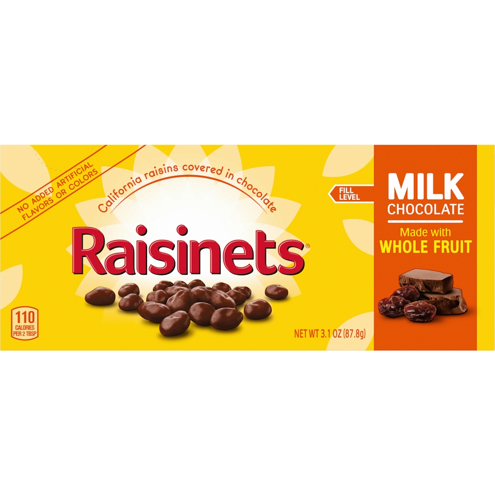 Grab a box of the perfectly classic, perfectly delicious, milk chocolate Raisinets. This classic candy combo of milk chocolate and plump, juicy raisins is a delicious chocolate snack option that can't be beat. Made with sun-ripened, juicy California raisins and gluten-free chocolate, this delicious treat has 30% less fat than the leading chocolate brands and absolutely no artificial flavors or colors. Perfect for movie nights at home, Raisinets bring the fun of movie theater candy right to your couch. This bulk candy snack box makes sharing concession stand candy with friends, family and coworkers fun and easy. Grab a box today and add the delicious taste of Raisinets to your snack time.