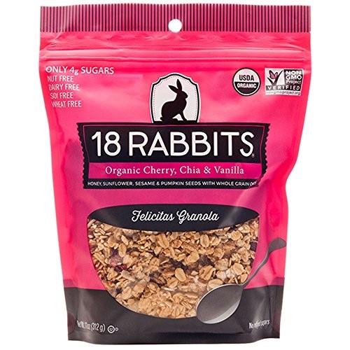 18 RABBITS ORGANICS CHERRY, CHIA & VANILLA GRANOLA IS MADE WITH WHOLE GRAIN OATS, HONEY, SUNFLOWER OIL, MAPLE SYRUP, SUNFLOWER SEEDS, PUMPKIN SEEDS, SESAME SEEDS, CHERRIES, CHIA SEEDS AND VANILLA. EACH 11 OZ. CONTAINER OF OUR GRANOLA CONTAINS ABOUT 11 SERVINGS OF 1/3 CUP EACH. OUR GRANOLA IS GLUTEN-FREE, NON-GMO AND ORGANIC.